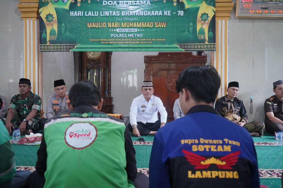 Pemerintah Kota Metro memberikan apresiasi atas terselenggaranya doa bersama dalam rangka Hari Lalu Lintas Bhayangkara ke-70 sekaligus peringatan Maulid Nabi Muhammad SAW, yang dilaksanakan Polres Metro di Masjid Sakinah Kota Metro, Rabu (10/9/2025).
